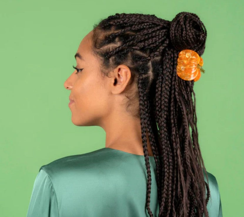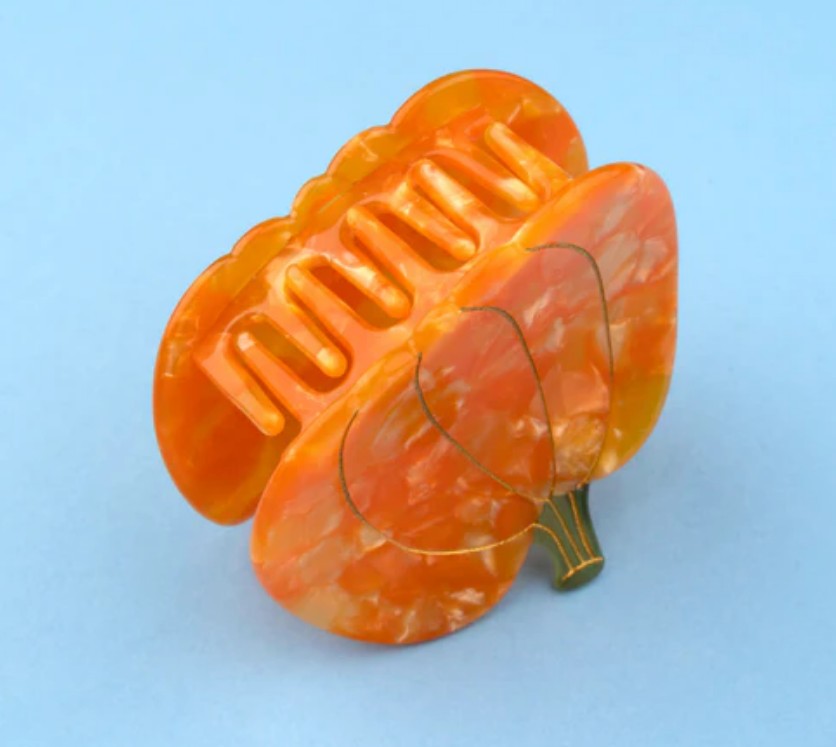 Sonbaharı karşılamanın en lezzetli yolu: elbette balkabağı! Parlak turuncu rengi ve altın detaylarıyla bu zarif saç tokası, mevsim kombinlerine sıcak ve neşeli bir dokunuş katıyor.