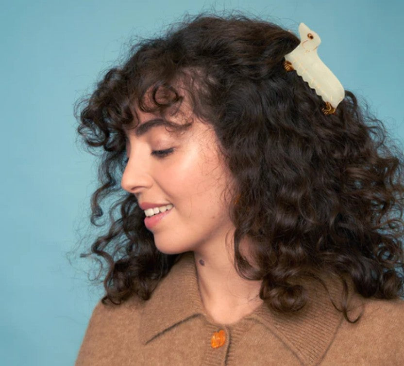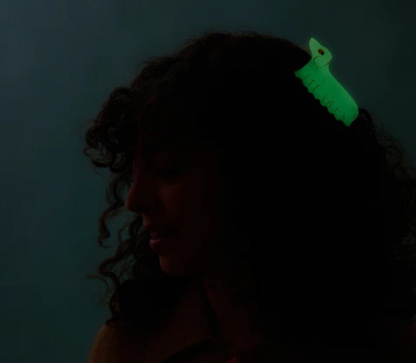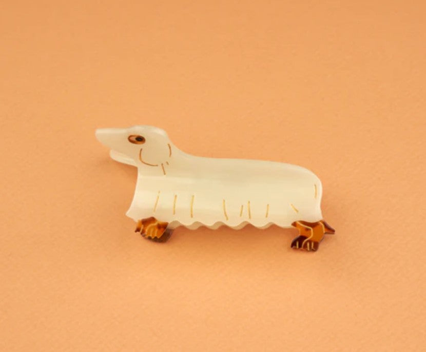 Vazgeçilmez dachshund (sosis köpek) tokamız, bu kez Cadılar Bayramı’na katılıyor ve en güzel fosforlu kostümünü giyiyor! Küçük kedi arkadaşına katılan bu sevimli hayalet köpeğe bayılıyoruz. Gecenin karanlığında parlayan, eğlenceli ve özgün bir saç tokası.