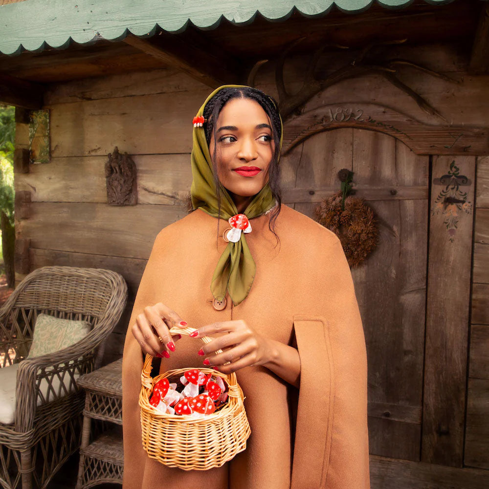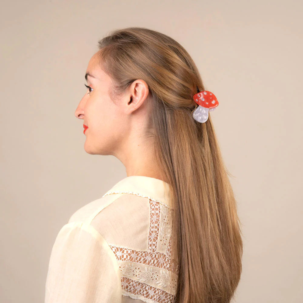 Beyaz benekli kırmızı şapkasıyla sonbaharın en ikonik mantarını andıran bu saç tokası, çocukluk anılarını geri getiriyor (okul gezisinde bize “dokunmayın” diyen öğretmenimizi kim unutabilir ki?). Orman altını çağrıştıran bu sevimli aksesuar, yarım topuz ya da atkuyruğuna kolayca takılarak saçlara eğlenceli bir dokunuş katar.