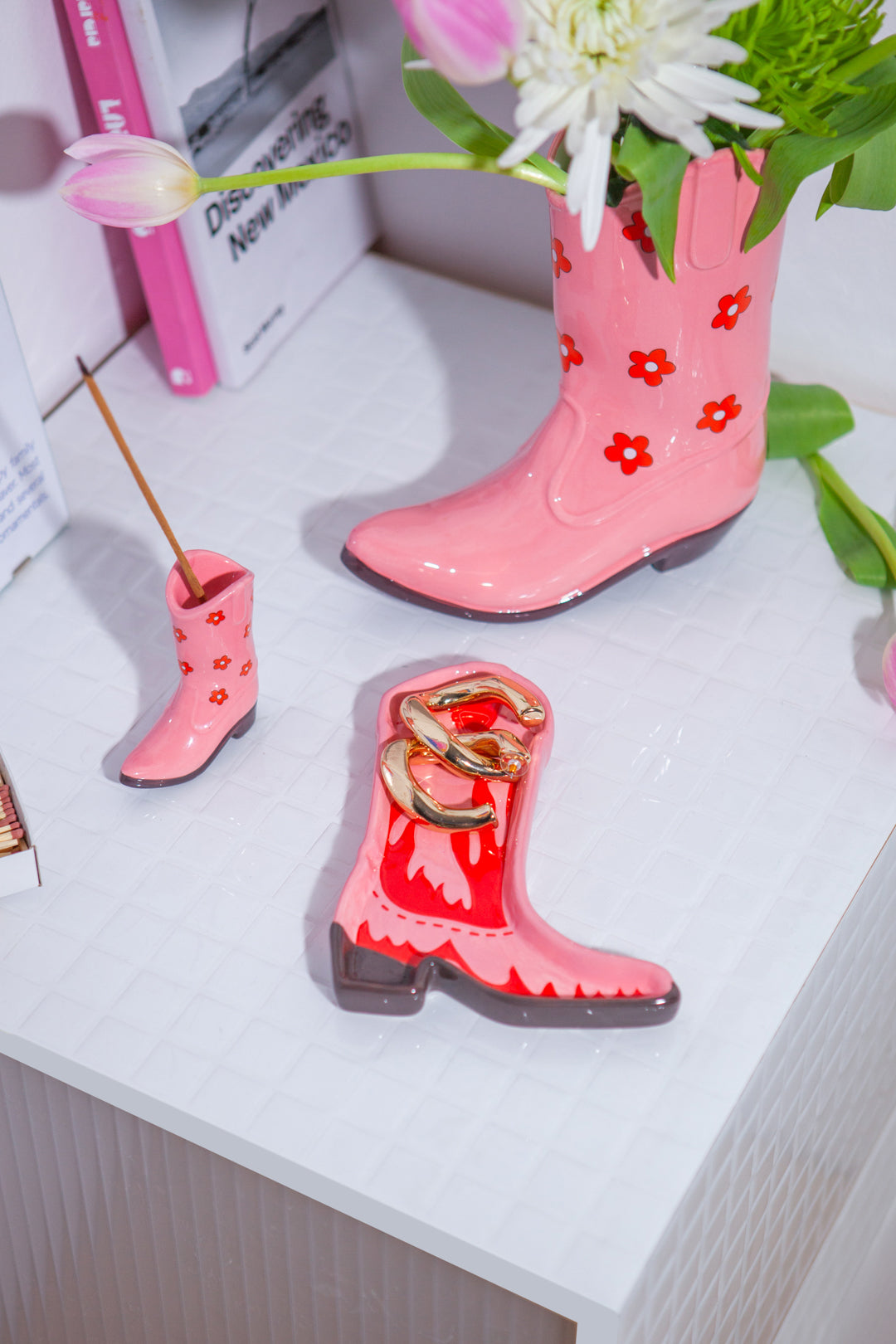 Kovboy çizmesi şeklindeki seramik düzenleyici, neşeli ve eğlenceli tasarımıyla bulunduğu ortama Western şıklığından bir dokunuş katıyor.