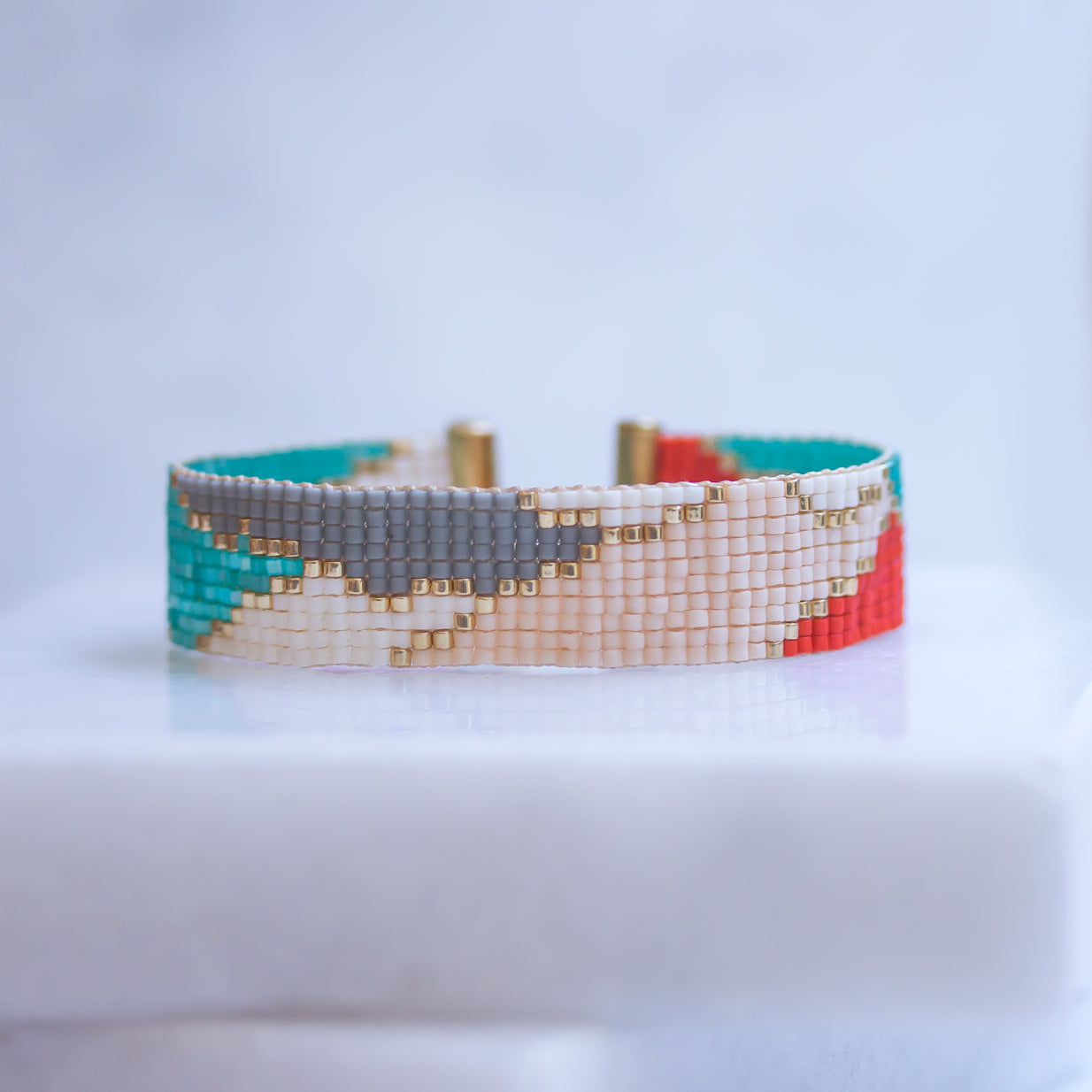 Wave bileklik, cam boncuklar ile dikilerek üretilir. Her parça, en yüksek el yapımı kalitesine ulaşmak için yetenekli zanaatkarlarımız tarafından özenle işlenmiştir. Bileklik kilitleri pirinç üzerine 18 ayar altın kaplamadır. Bitimindeki zincir ile farklı bilek kalınlıklarına uyum sağlar.