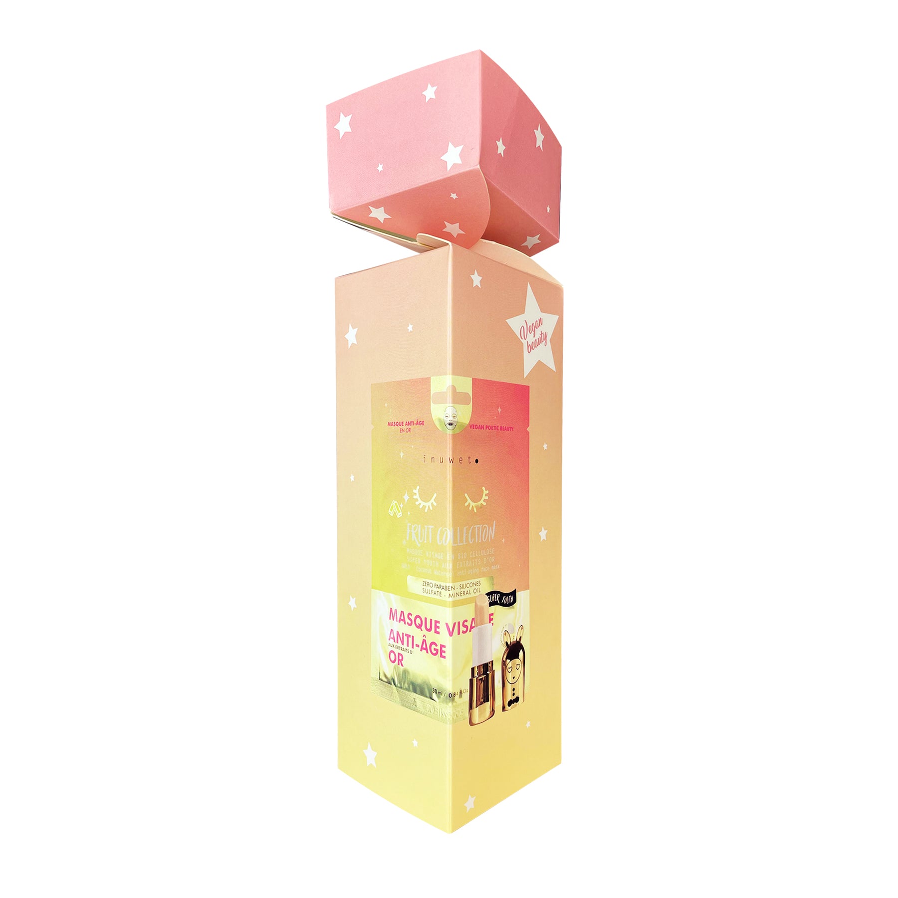 Set, cildi pürüzsüzleştiren ve aydınlatan yaşlanma karşıtı biyo-selüloz yüz maskesi ile dudaklara yumuşaklık ve besleyici bakım sağlayan, hoş kokulu metalik dudak balmından oluşur.