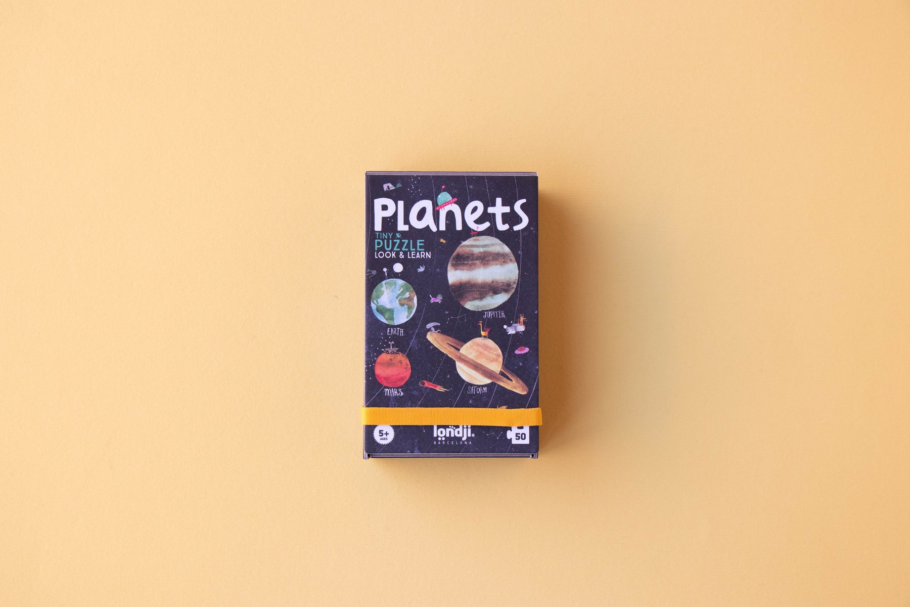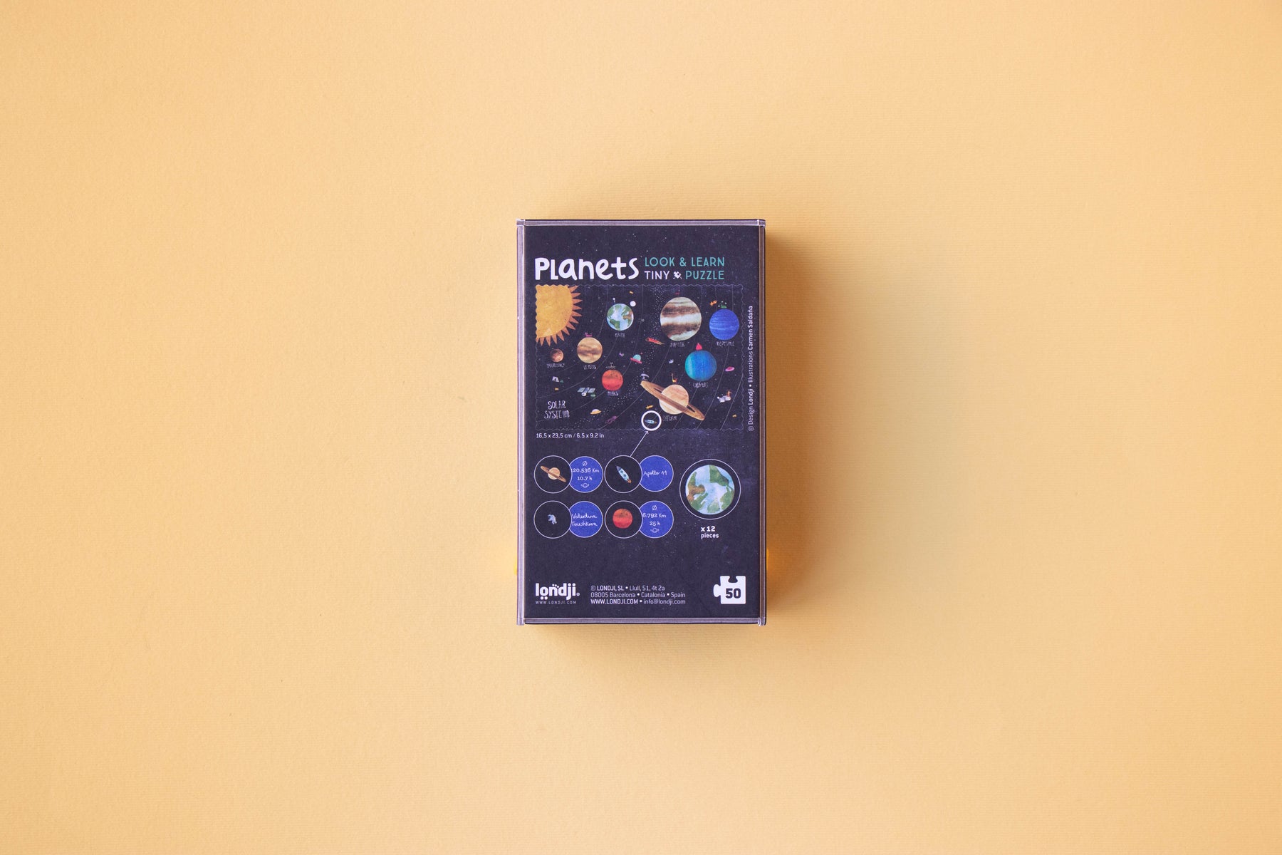 Gezegenler ve uzay hakkında 12 gözlem parçası içeren 50 parçalık küçük bir puzzle. Sürdürülebilir ve yerel olarak üretilmiş bir oyuncak. Cep boyutunda, seyahat için ideal.