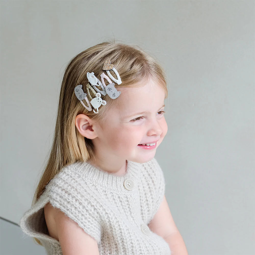 Mimi & Lula Cat & Mouse Mini 5'li Toka, iki yumuşak sevimli kedi yüzü, iki tatlı küçük fare ve altın simli bir kalple dolu harika bir set sunuyor. Karıştırıp eşleştirerek çeşitli şirin saç stilleri yaratmak için ideal.