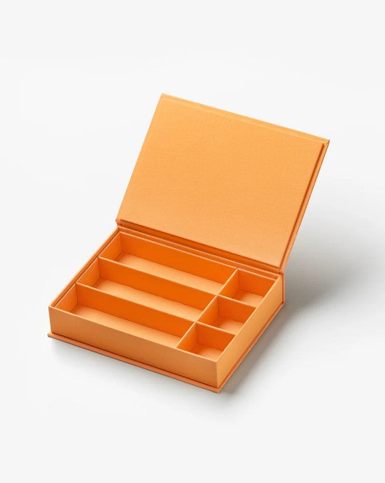 Takı kutularımızla evinizde düzeni ve şıklığı bir arada yaşayın. Kapalıyken zarif bir kitabı andıran kutular, açıldığında üç büyük ve üç küçük olmak üzere toplam altı bölmesiyle anahtar, takı, kalem ve kulaklık gibi eşyalarınızı düzenli şekilde saklamanızı sağlar.