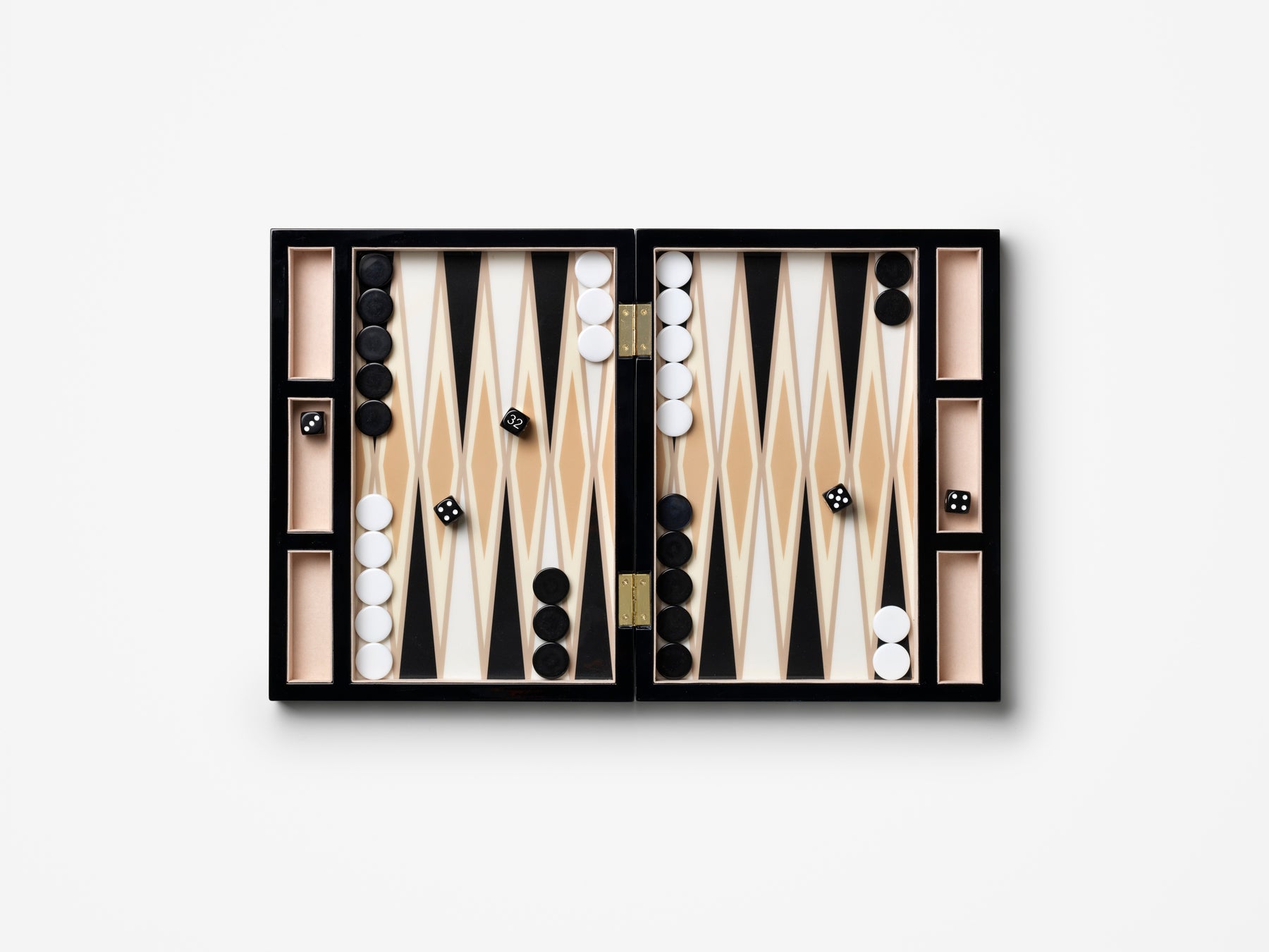Lake tavla seti, siyah, beyaz ve krem tonlarında çarpıcı eklektik bir desenle tasarlandı. Bu özel set, klasik tavla oyununu ifade dolu bir tasarımla buluşturuyor. Büyük ahşap oyun tahtası ve parlak akrilik taşlarıyla hem oyun oynarken hem de sergilerken dikkat çekici bir parça sunar.