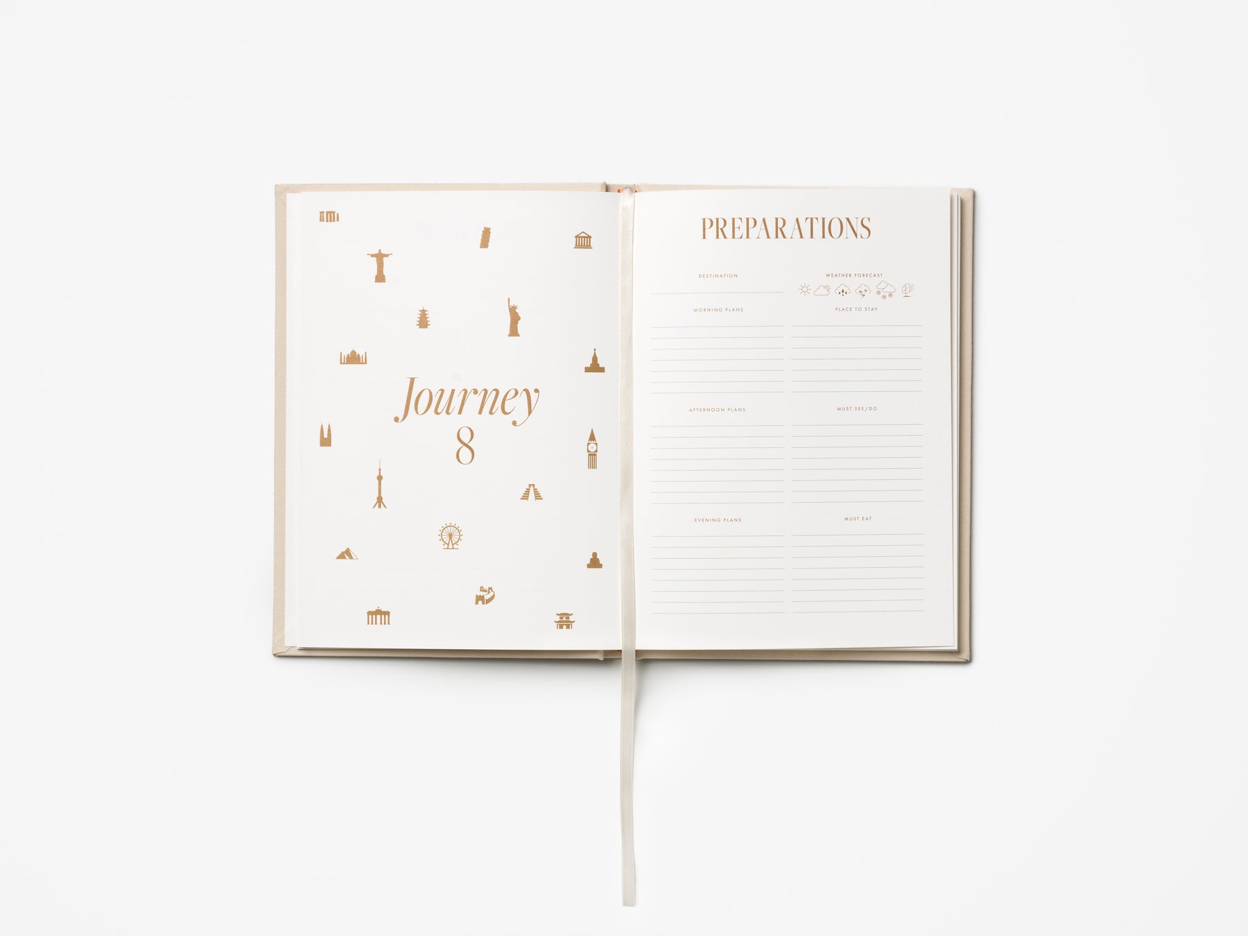 Bon Voyage – Seyahat Günlüğü ile maceralarınızın her detayını kaydedin. Mavi ve bej tonlarında, kumaş kaplı şık kapağıyla bu günlük; yolculuğunuza hazırlanmanıza, yaşadıklarınızı not etmenize ve anılarınızı yıllar boyunca saklamanıza yardımcı olacak şekilde tasarlandı