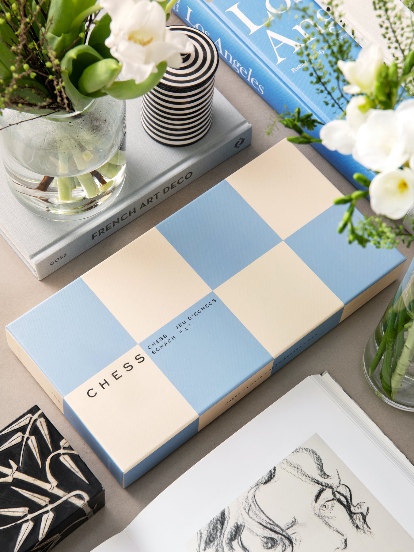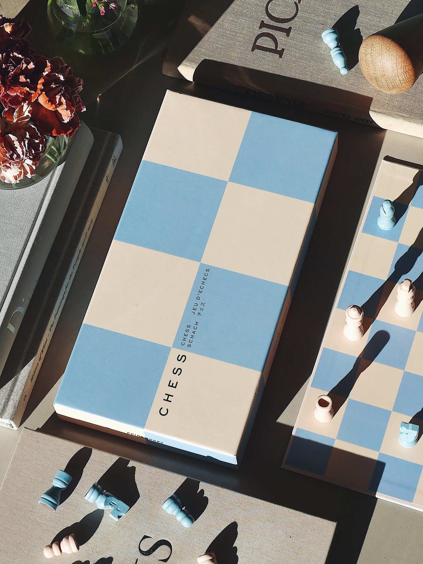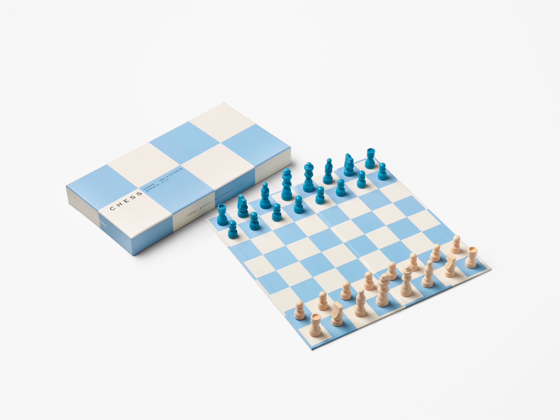 Play koleksiyonumuzun gökyüzü mavisi renk paletiyle tasarlanmış Satranç setini keşfedin.