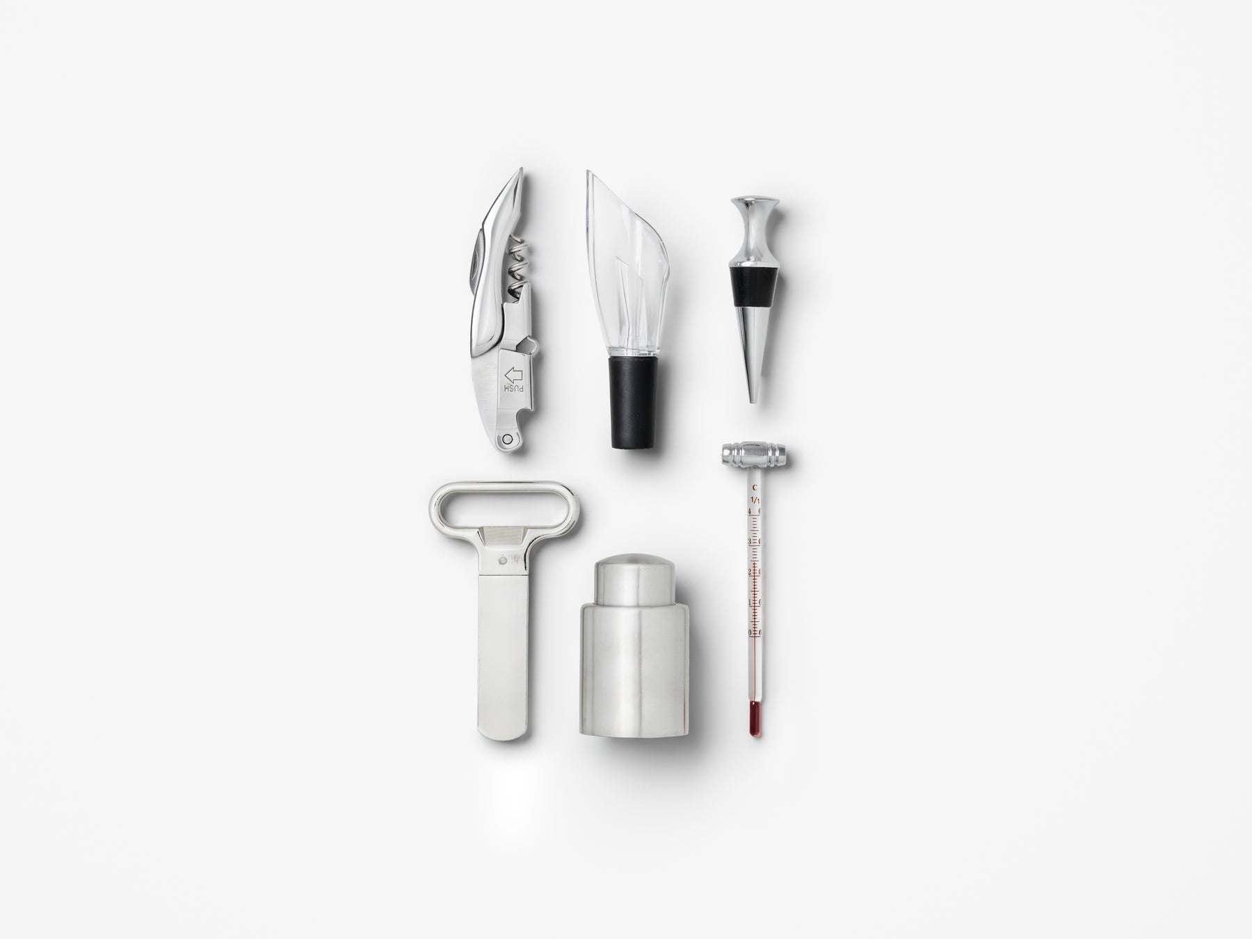 Setin içinde şarap keyfinizi tamamlayan temel araçlar -açacak, tıpa, sürahi ve damlalık bulunur—. Tüm ürünler paslanmaz çelikten üretilmiş olup bulaşık makinesinde yıkanabilir| |