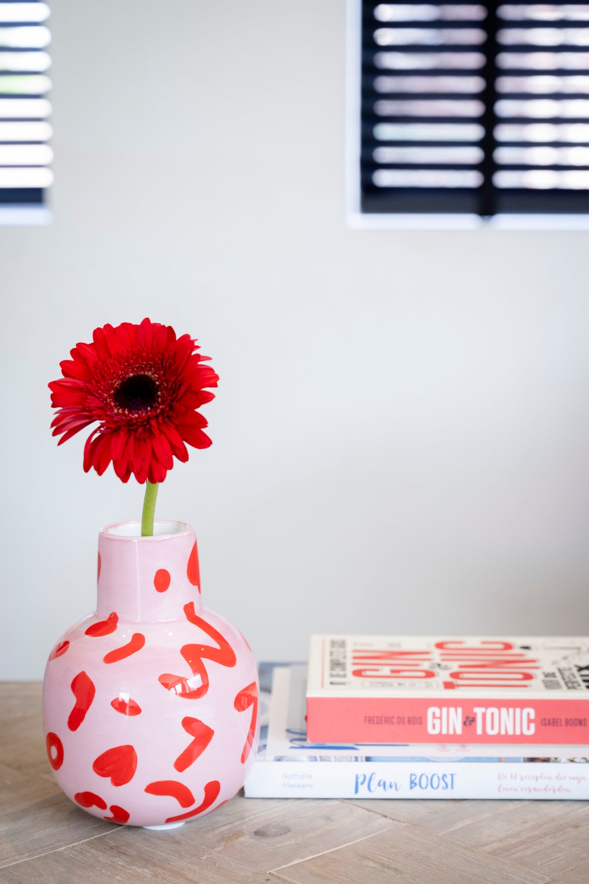 Organik formu ve pembe ile kırmızının canlı uyumuyla el yapımı bu vazo, her iç mekânda göz alıcı bir parçadır.