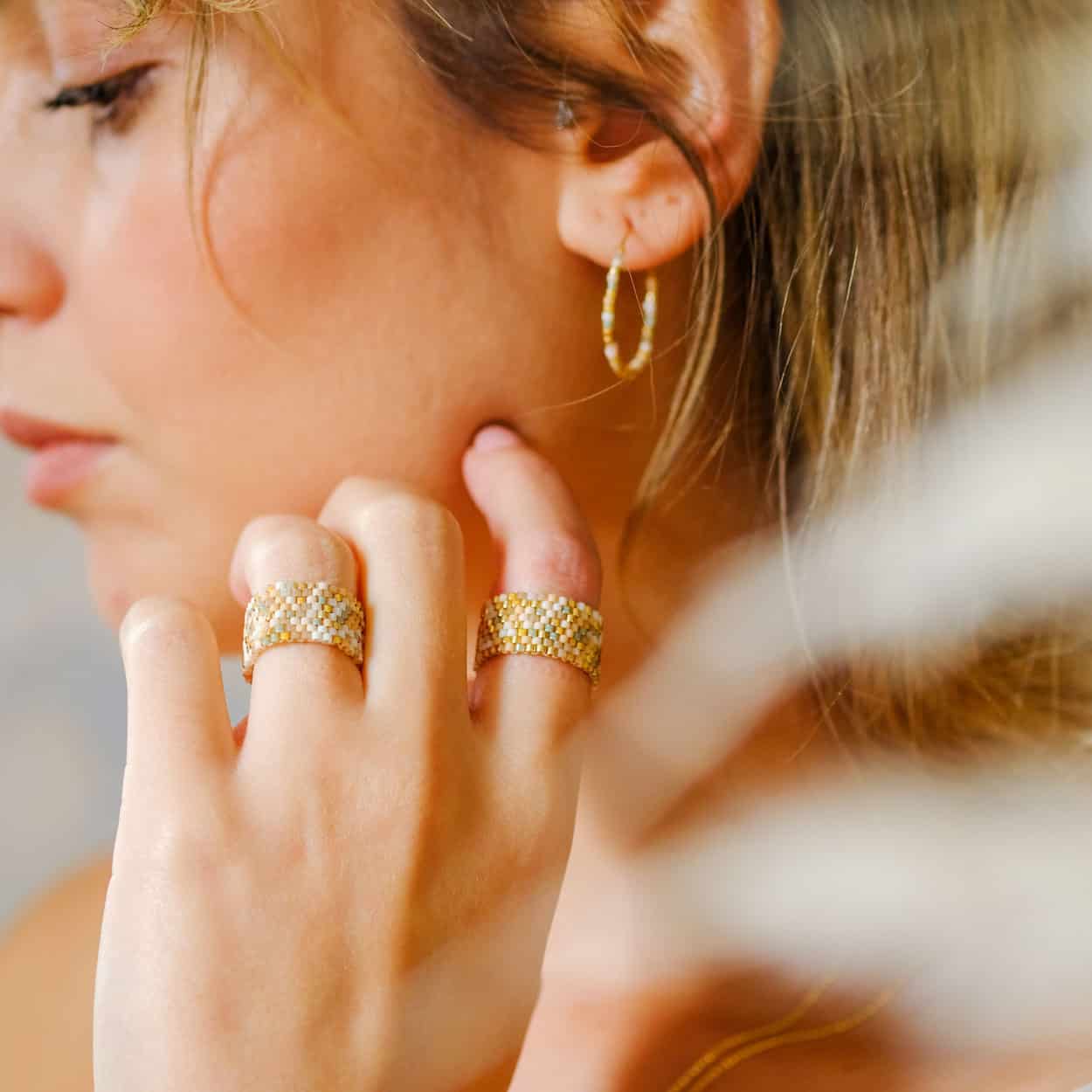 Noah Nude yüzük, cam boncuklar ile dikilerek üretilir. Her parça, en yüksek el yapımı kalitesine ulaşmak için yetenekli zanaatkarlarımız tarafından özenle işlenmiştir.