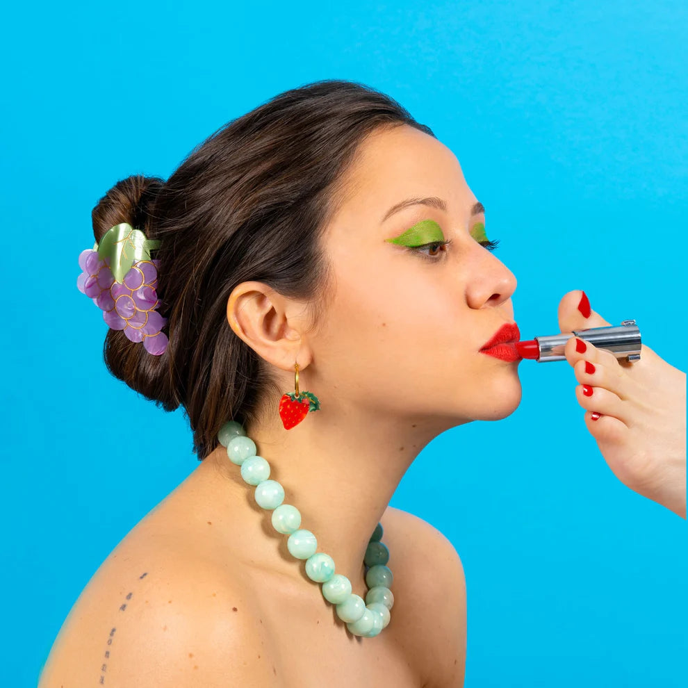 Işıldayan leylak ve yeşil tonlarında, harika bir mor üzüm demeti saç tokası olarak karşınızda. Bu meyvemsi saç aksesuarının romantik ve vintage havasını çok seviyoruz, altın detaylarla işlenmiş ince işçilikleriyle adeta bir saç mücevheri!